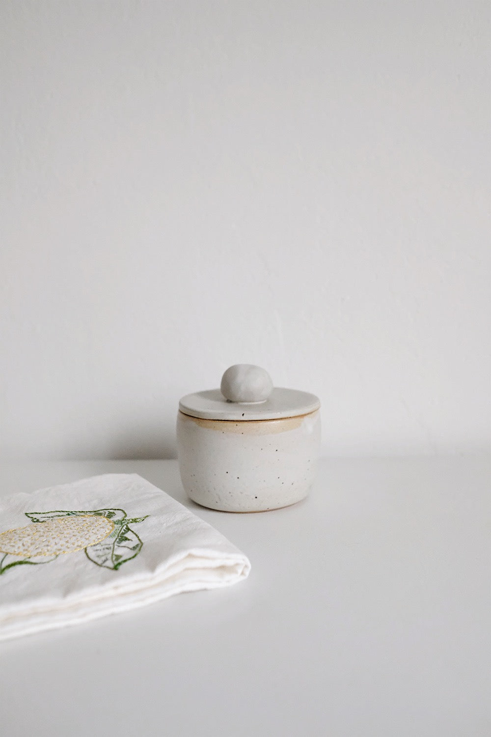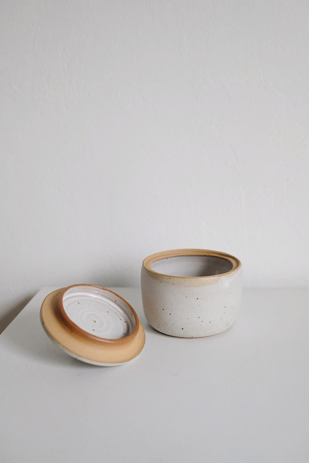 handmade by me. features a lightly speckled tan clay body with a matte white glazed exterior. perfect for holding flakey sea salt, treats, or whatever you need to contain.