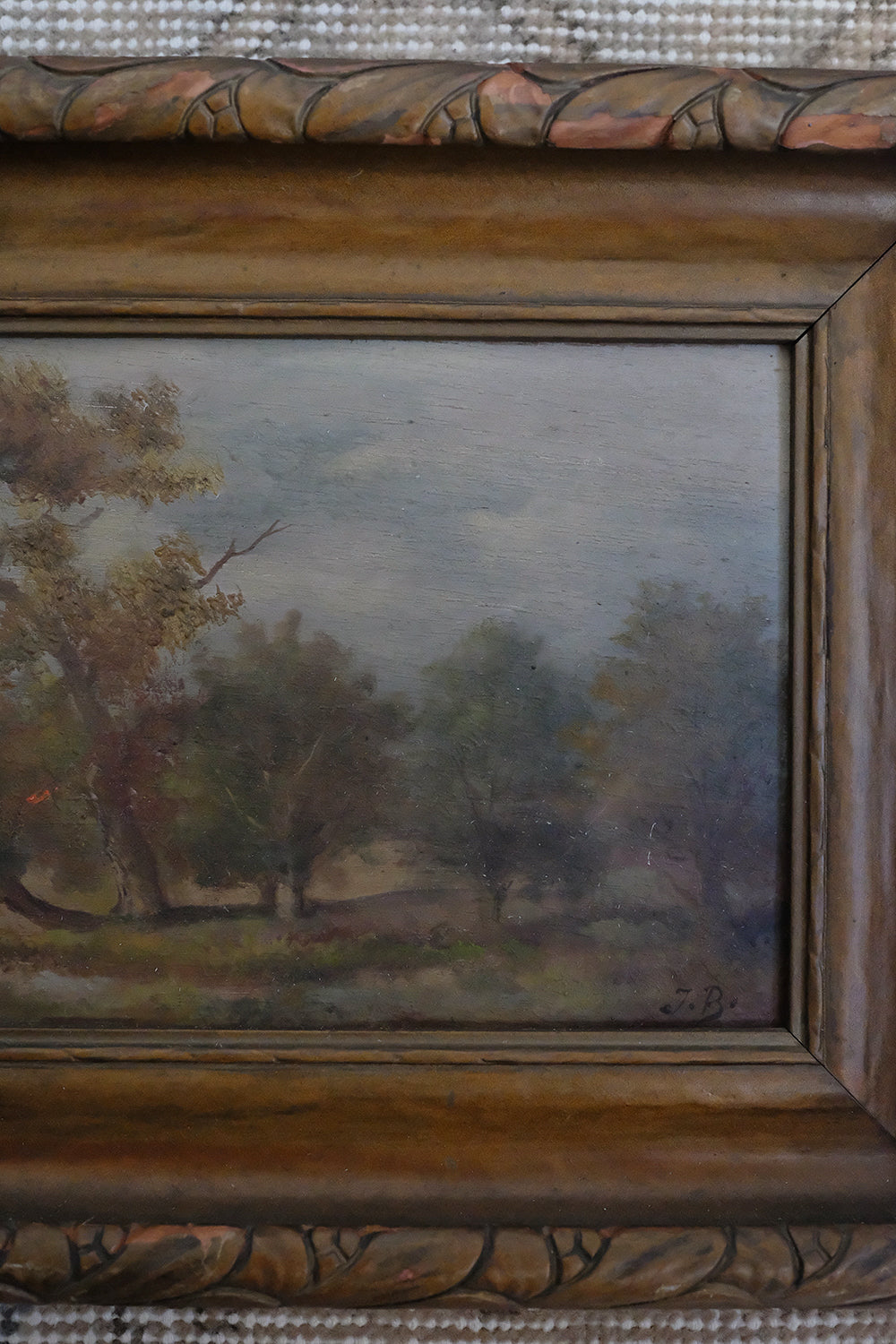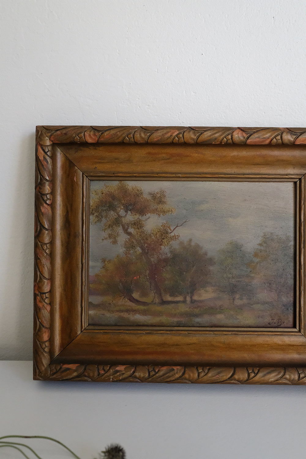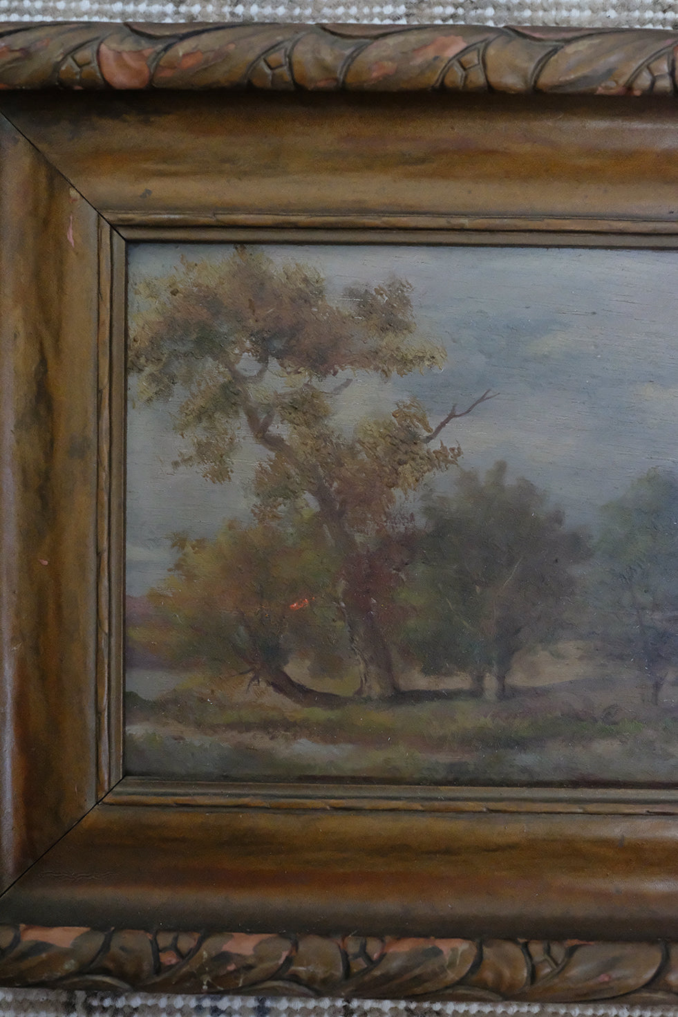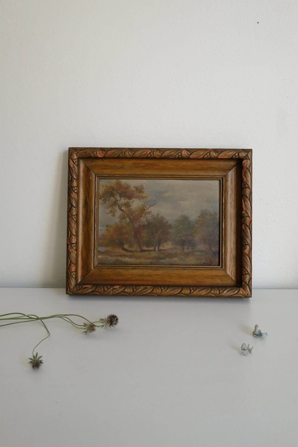 this original antique oil painting features an autumn forest scene. it is signed by the artist and includes an inscription on the back to the original owners. the frame shows some age-appropriate wear, but the piece is overall in excellent antique condition.