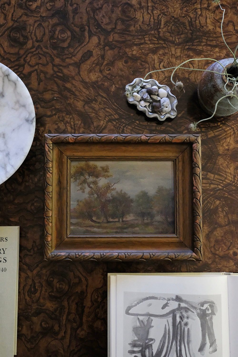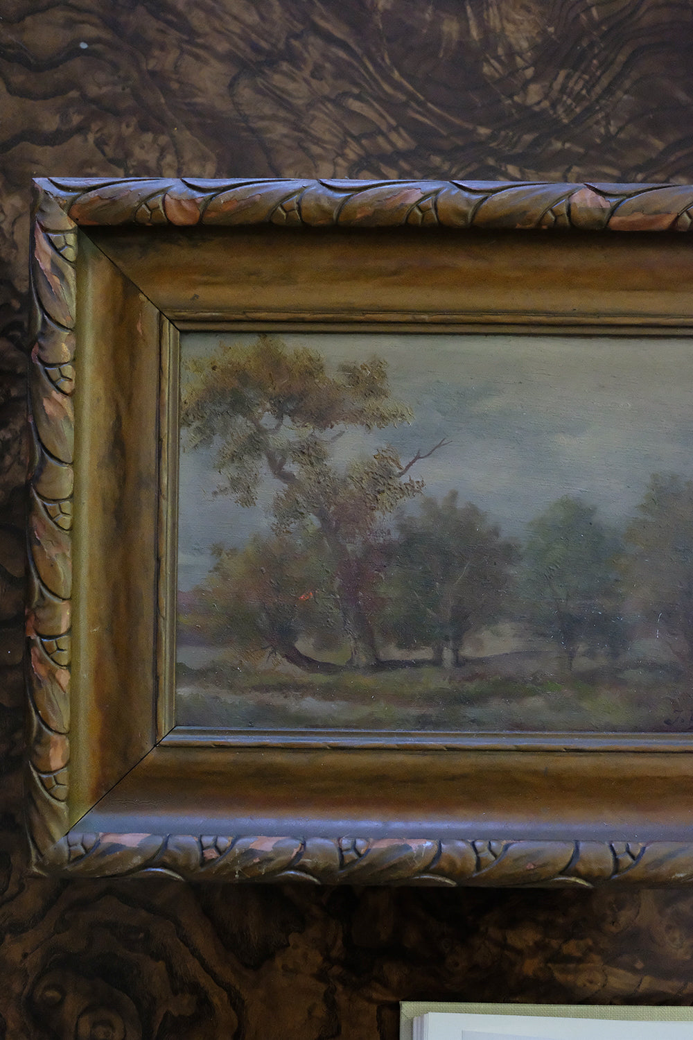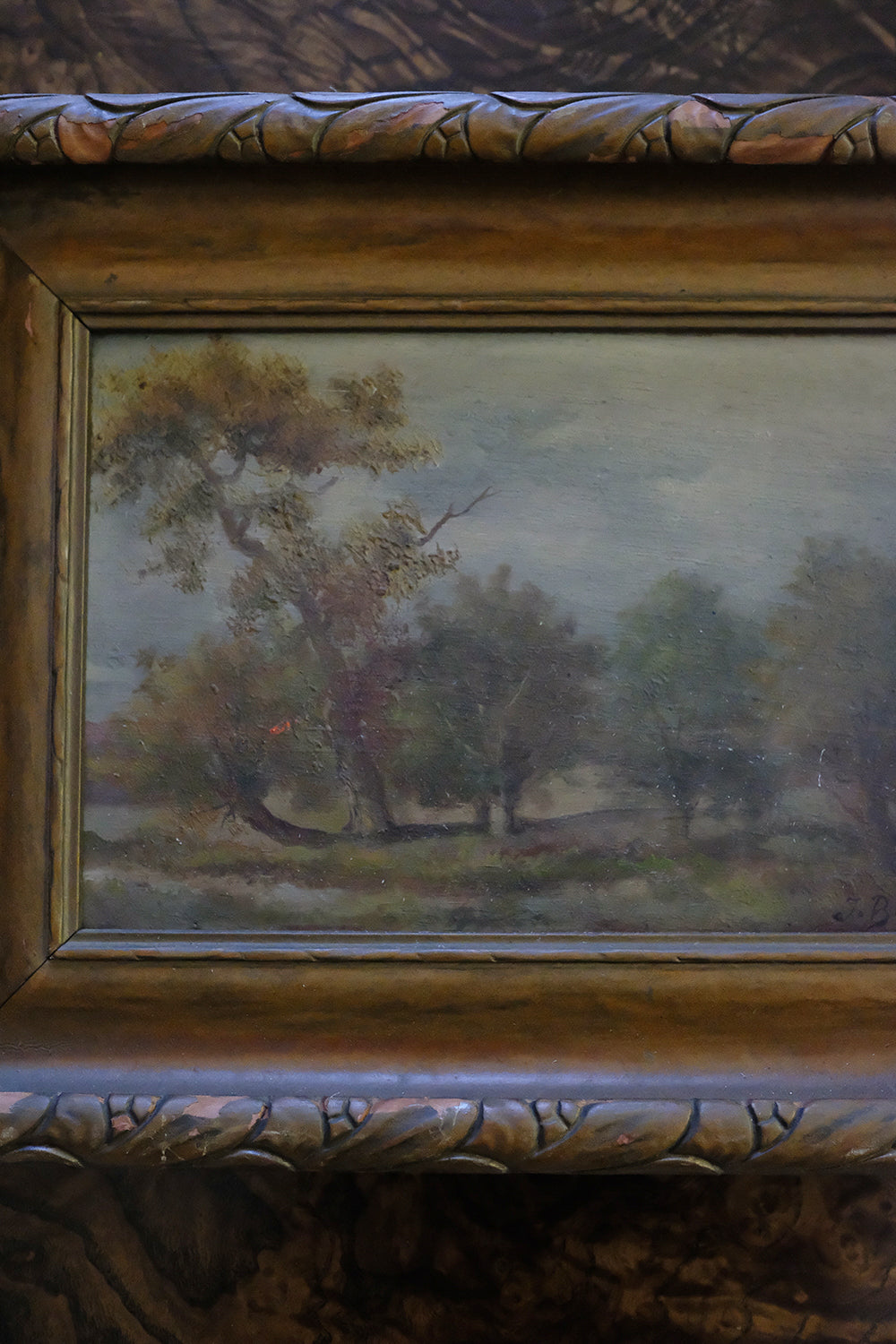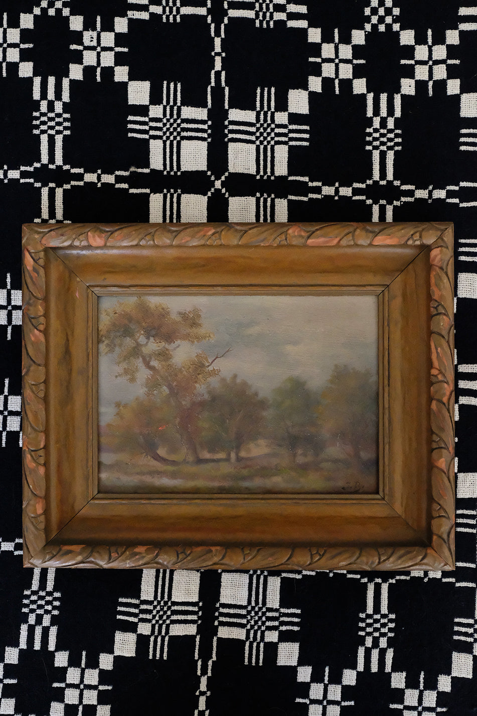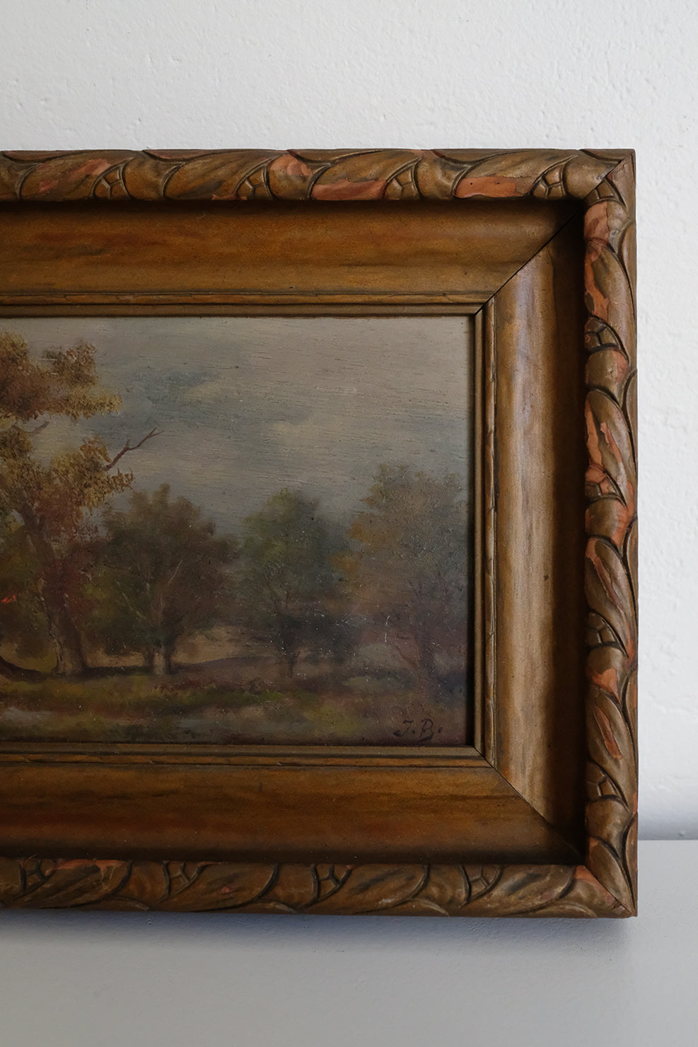 this original antique oil painting features an autumn forest scene. it is signed by the artist and includes an inscription on the back to the original owners. the frame shows some age-appropriate wear, but the piece is overall in excellent antique condition.