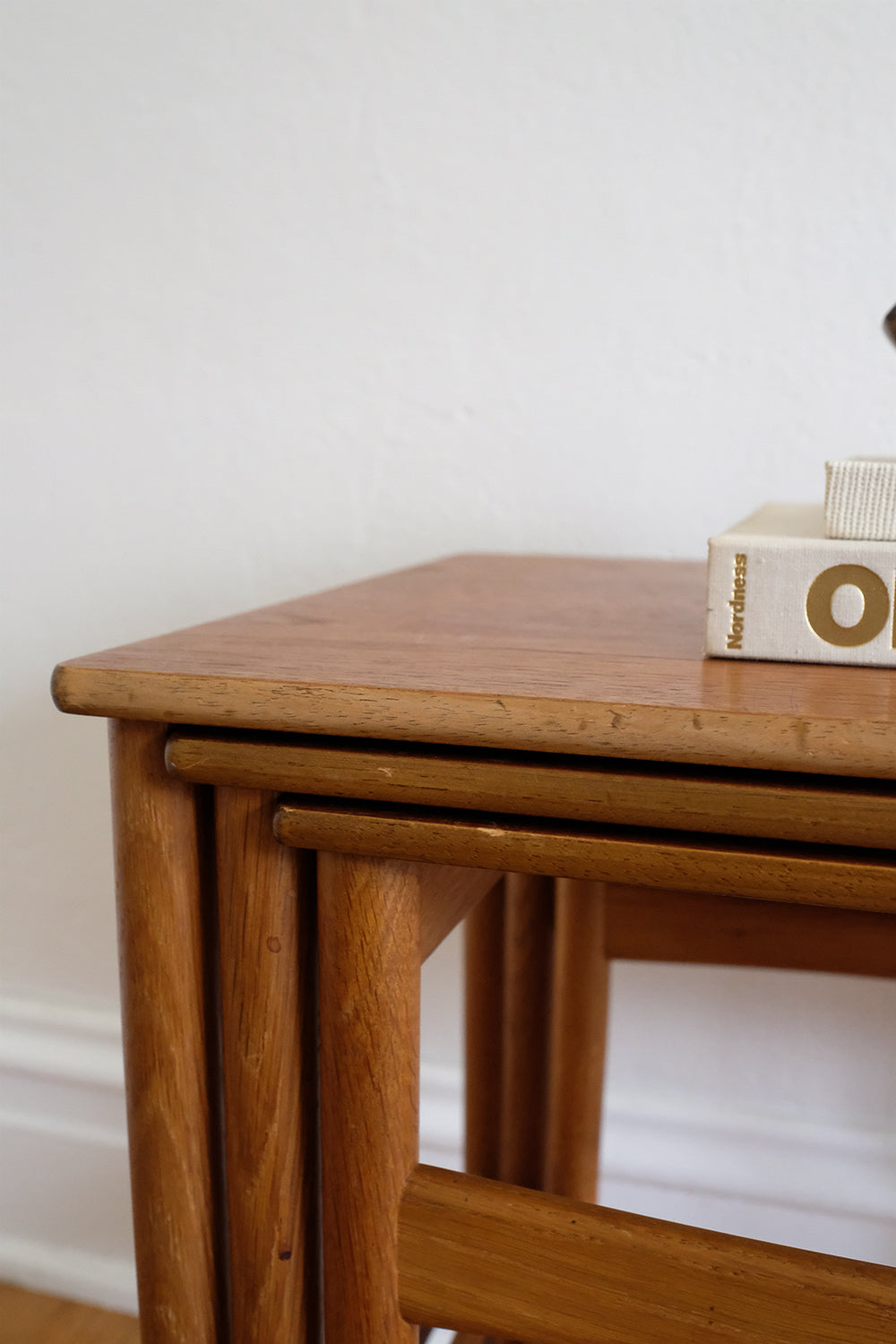 vintage teak nesting tables, designed by Hans Wegner for Andreas Tuck. made in Denmark circa 1960s. tables show light signs of wear including fading to the finish as shown, however, these could be easily re-conditioned to like-new condition. these timeless, classic, midcentury tables are in excellent vintage condition considering their age. sourced from the estate of the original owner.