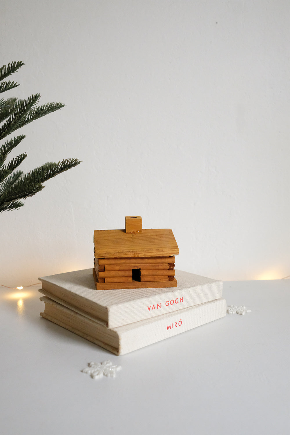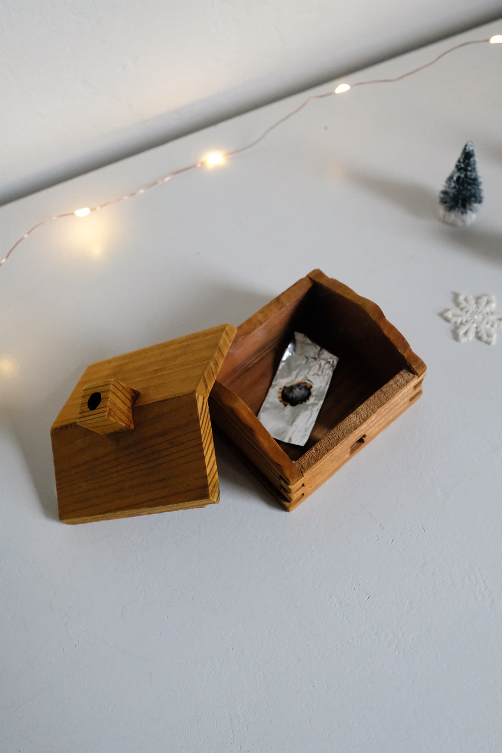 log cabin incense smoker. the roof comes off and a cone of incense can be placed inside and lit. once the roof is placed back on, smoke billows out of the chimney. signs of wear, including a burn on the floor of the interior which is purely aesthetic and does not affect its function but is reflected in the price. I recommend lining the bottom with foil to prevent further burning.