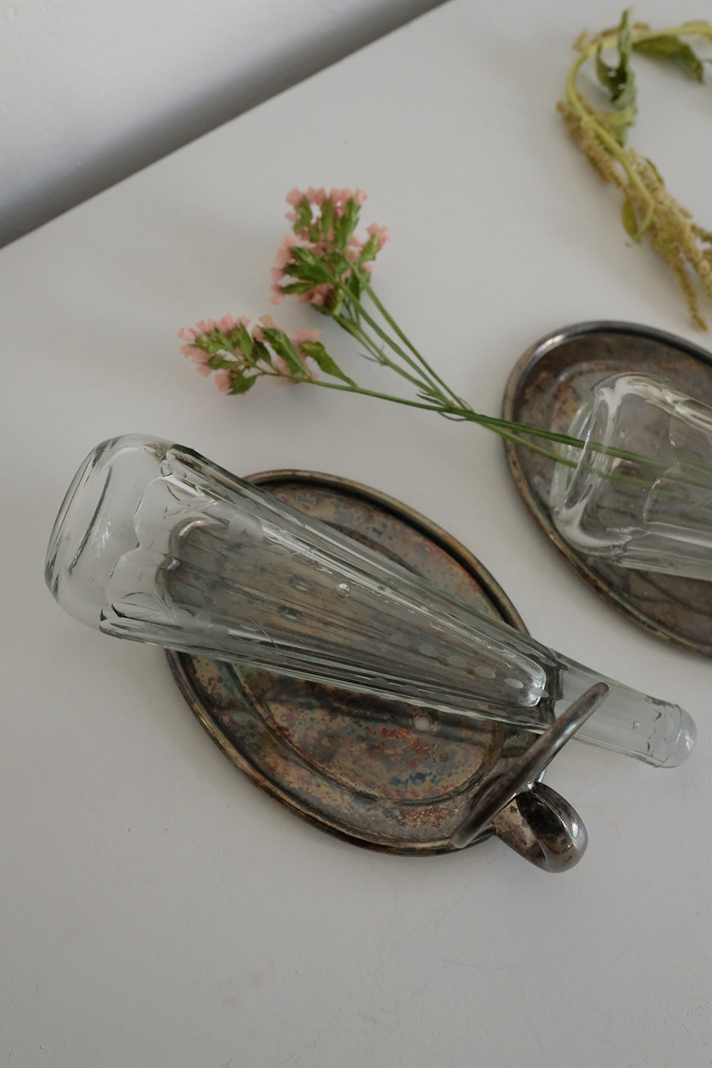 this vase can easily translate from antique cars to today's homes by being used as a wall sconce. the distinctive hand-cut, etched glass design beautifully refracts light. watertight, it is suitable for holding both fresh and dried flowers. this is truly a one-of-a-kind piece. each sconce includes 2 decorative pushpins for mounting to the wall, though I'd suggest affixing this more securely with screws due to the weight of the glass vase. a few minor scratches are on both pieces and some patina to the metal backplate, however, each piece is in overall excellent antique condition.